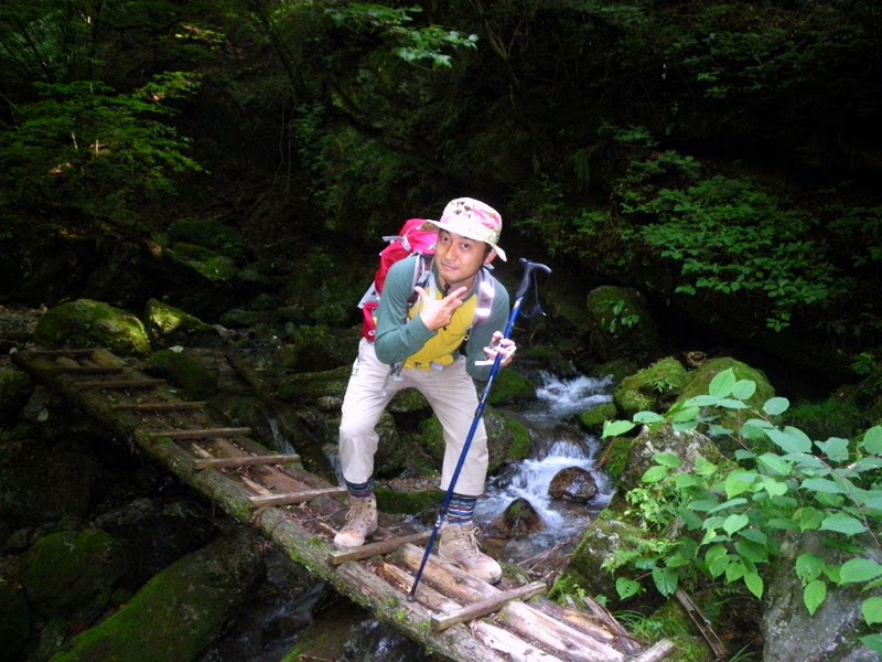 バスを降りたら沢沿い林道の緩やかな登りを朗らか&軽やかにズンズンと。朝メシしっかり食べて来たのに早くも腹がキューッ..の減点オヤヂ。空気は最高にウマいけど、空気じゃお腹はいっぱいにならないもんねー(T.T)。