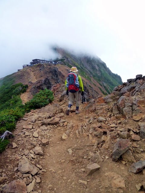 道の途中にちょっと見える青い屋根は硫黄岳山荘。