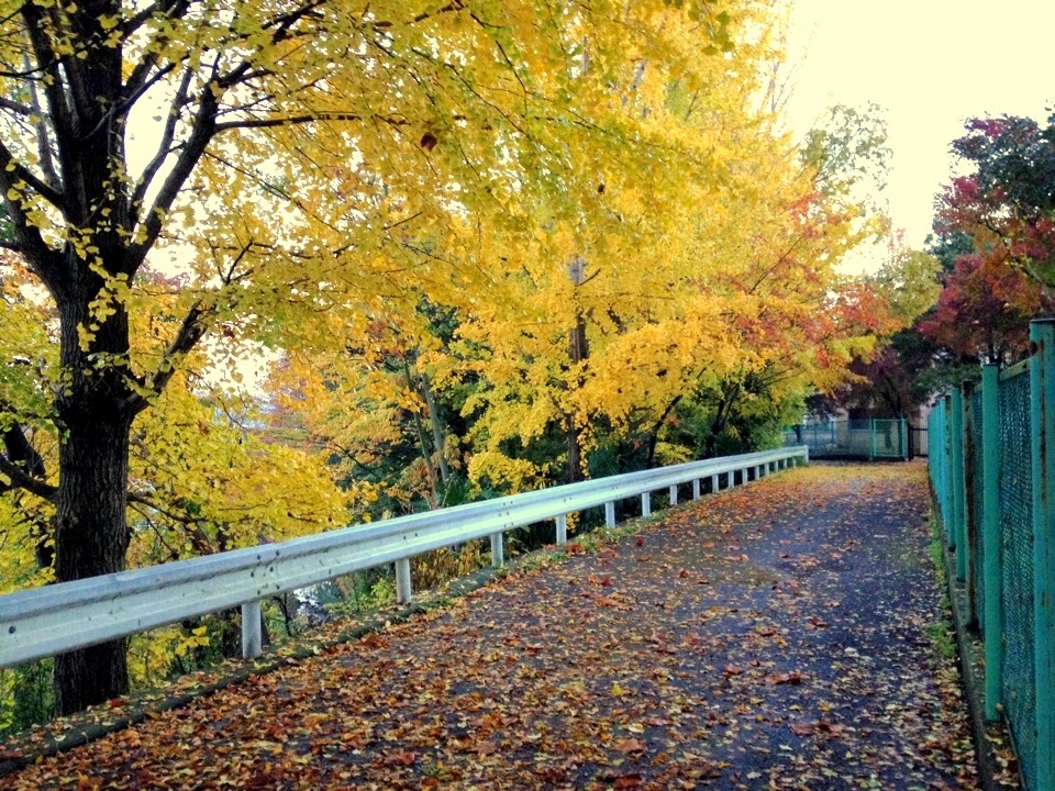 落葉カーペット状態だった学校裏は雨と風でまだらに。