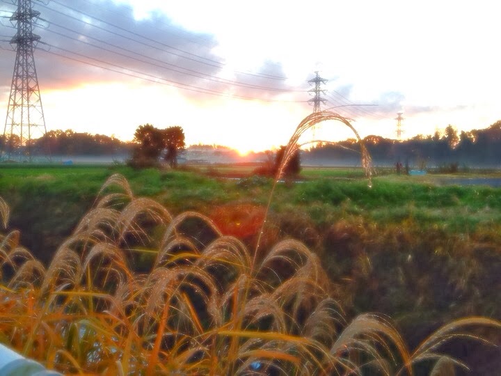 朝もやを纏った田園より、しばし朝陽に見入る。