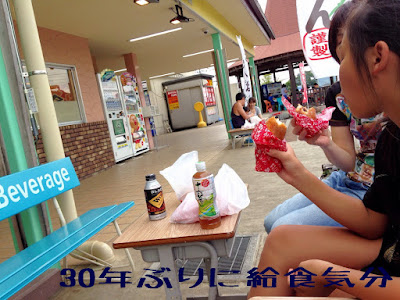 テラスの小学校机で揚げパンとか食パンをモグっと。